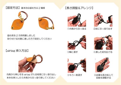 内側から革紐をairtag本体が入る程度引っ張り出し本体を挿入したら外側から引っ張り戻してください